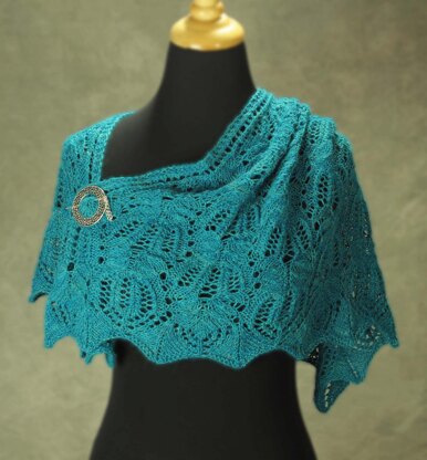 The shawl is worked bottom up. The stitch pattern is charted to make the transitions simple to follow, as each section decreases. Each right side row shortens by four stitches, making the work “feel” as though it is speeding up as you approach the end. The lace pattern appears complex. It is formed with only two sets of four pattern rows which are each repeated three times and then offset, over 24 rows. The project is listed as advanced because there is patterning on both the right and wrong sides of the work.