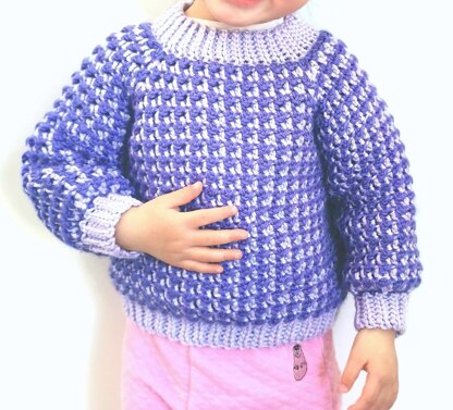 The main body pattern of this two-colour sweater consists of double crochet and slip stitch techniques. It features a raglan style design working from the neck ribbing all the way down to the bottom ribbing with no seaming required. With a raglan yoke style, the increases usually happen at the four corners of the garment which will gradually form a rectangular shape as we crochet until it reaches the length needed for armholes. The sleeves are worked in the round with the cuffing ribbing crocheted directly onto each sleeve.
