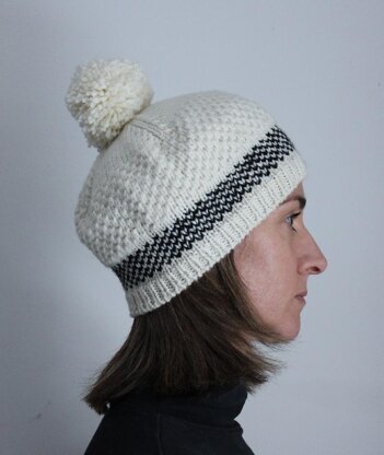 This hat is worked in the round and features a tubular cast on edge, simple colorwork, and some interesting texture to the body of the hat. The four point raglan decreases shape the crown and a pompom tops it off.