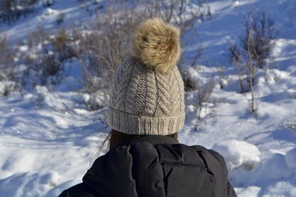 This is a warm and thick hat, perfect to wear during heavy snowstorms, and even better when worn with a shawl. With worsted yarn, it knits up quickly. Instructions for the cables are charted and written.