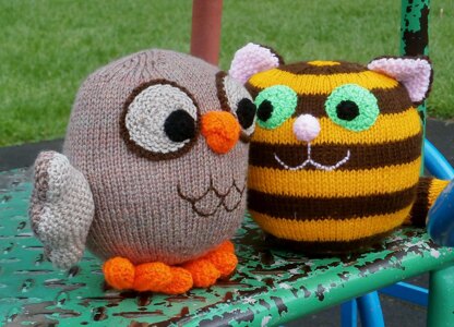 Tension is not essential for this project. The toys are knitted mainly in stocking stitch, with a little short row shaping for the owl's ears. The 'boat' doubles as a storage bag for the toys.