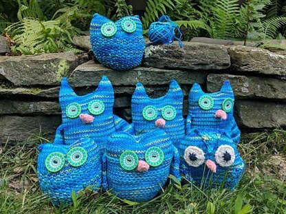 In the summer of 2012 I went with my mom and my kid to a yarn store. Of all the yarns that I saw and wanted to buy I finally picked up a single skein of fingering weight yarn named Heritage by Cascade Yarns. I had no idea what I would use the yarn for, I just liked the colors. Over the years I have created patterns for knitted owls, and made one of each owl pattern from this one skein of yarn.