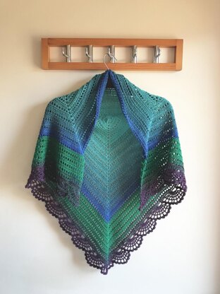 The Peafowl Feathers shawl has a slightly different construction starting with creating a triangle motif working around all 3 sides of the triangle. The border is then added to 2 sides of triangle to increase the width.