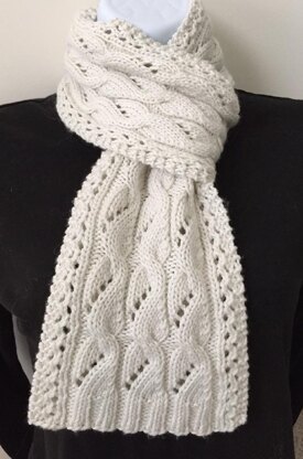 Phoebe is a simple, yet slightly different take on the basic cabled scarf pattern. She sets the theme for my Piccadilly Collection of cowls, scarves and wraps. Phoebe has repetitive columns of lace cables framed with zig-zagging (eyelet) lace borders at the sides and 2x2 ribbing at the top and bottom. Her lace cablesare carried throughout the Collection. Choose any number of repeats to change Phoebe’s look—from a skinny to wide scarf, or go even larger as a sporty wrap.