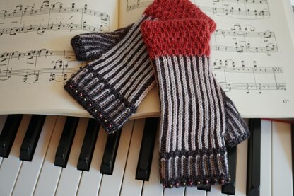 Three (or two) colours and simple variations of plain brioche ribbing are combined to achieve the unique look of these fingerless mitts. You should be comfortable working in the round over a small circumference and familiar with the basic brioche stitches brk, brp and sl1yo, brioche increases and decreases (photo tutorial included for left- and right-slanting brioche decreases). The mitts are finished with an optional beaded bind-off. Instructions are written round by round.