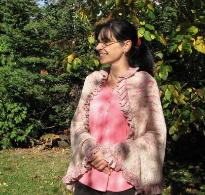 Perfect to knit warm up shoulders and neck for winter evenings ! This shawl / wrap is octogonal, knitted in one piece, with romantic ruffled edge. It measure 73” long and 24” wide, after blocking.