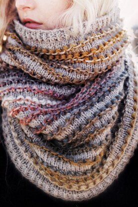 Description: "Classic knit ribbing and sequences of mesmerizing, textured knots flow harmoniously while gradually shifting colors amidst a background of classic stockinette stitches, making The Rosewood Cowl a truly delightful and enjoyable accessory to knit!"