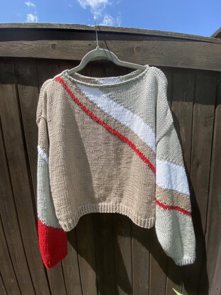 This sweater has a comfortable boxy shape that is flattering, lightweight and easy to move around in. It can be knit in the striped pattern as shown or knit in a solid color for a beginner.