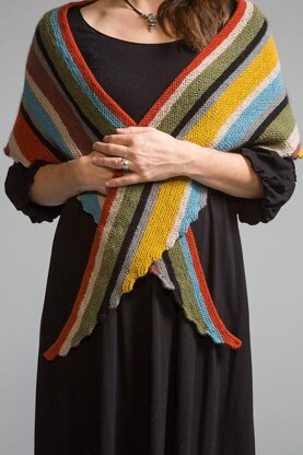 Eight or more colors combine for a riot of stripes in this long triangular wrap. Begin at the tip and increase in steps at regular intervals on each edge, until you reach the longest edge. A great stash buster, The Runway Wrap requires approximately 1000 yards of similar weight yarns in different colors. Be creative–there are no rules! Use the colors as you wish.