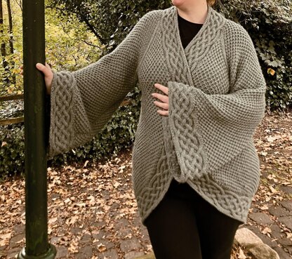 An oversized, wrap-around cardigan in sumptuously squishy fabric. Inspired by Celtic designs with a hint of the kimono. Available in XS (S, M, L, XL)