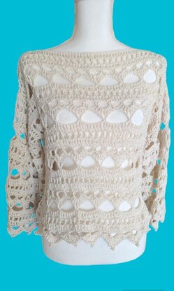 This beautiful crochet lace pullover with an open lace pattern, featuring a combination of double crochet stitches and chain stitches to form elegant shell motifs. The design is airy and lightweight, making it perfect for layering in any season. The intricate yet repetitive stitch pattern highlights the craftsmanship while remaining accessible for crocheters of all levels. The scalloped hemline and detailed sleeves add a touch of sophistication, making this pullover a standout piece in any wardrobe.