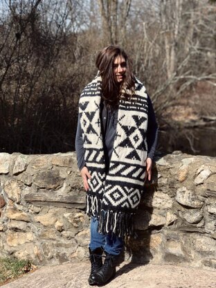 This pattern is written for both Super Bulky yarns and Bulky yarns. The dimensions for the Super Bulky Scarf, neglecting fringe are 75" L x 12" W, and utilizes the US 13 9.0mm needles with about 420 yards of Main (white) color and 250 yards of contrast (charcoal color).