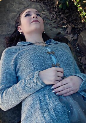 A mid-thigh length jacket, knit from the bottom hem up, with hems and front bands trimmed with knit/purl snowflake motifs. The jacket is cast on at the bottom hem and worked back and forth up through the waist shaping to the underarms. The body is then placed on hold and the sleeves are knit from the hem up to the underarms. The sleeves and body are joined and shoulders are worked with raglan shaping. The collar is knit in one with the jacket. Minimal seaming at the underarms finishes the jacket.