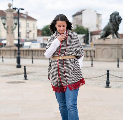 “The Thin Red Line” is a rectangular shawl, worked from side to side in long rows in a very easy stitch pattern. This is a very relaxed project that does not require counting and takes just a bit of attention. Two contrasting main colors and one additional different (again contrasting) color are used. Color is changed at the end of each row, leaving the tails, which are later incorporated inside the fringe.