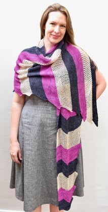 This stripey shawl is starts at one corner and gradually increases to an asymmetrical triangle. Two colors ease into relaxing garter stitch – albeit with some zigzags – while a third evolves into a mesh lace for knitting and visual interest. A jagged edge represents the sisters’ difficult lives, the chevron at the top their desire to go back to Moscow. The pattern also includes instructions for how to adapt to less or more yardage, meaning you can maximize your available yarn.