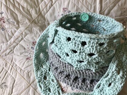 Unique trellis design. Sturdy and roomy. Crocheted entirely in one piece with no seams. Perfect tote bag for any occasion. Simple crochet stitches throughout.