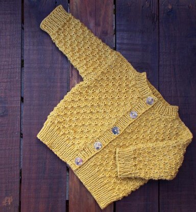 The Tuppence cardigan is knitted bottom up. There are 5 sizes: 3 months to 3 years.