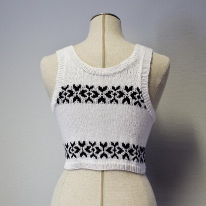 This sporty top was designed for the fundraising event “Walk the Walk”, a walking marathon in aid of breast cancer research where participants, female and male, walk in a bra all night. Most of the Walk the Walk participants decorate their bras, and I designed this bra cover especially for Emma Kennedy who is a huge fan of Danish crime thriller The Killing (Forbrydelsen) in which the main character, Sarah Lund, wears a number of amazing hand-knit nordic jumpers, hence the fair-isle pattern.
