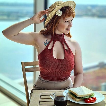 The Vivien Halter is a sexy knitted halter top, designed with negative ease so she fits you nice and snuggly, hugging you in all the right places. She features a nipped in waist, cropped length (just long enough to reach those high rise skirts and trousers) and cheeky peekaboo windows which come in a variety of depths from FREAKY through CHEEKY to BREEZY, so you can choose what is comfortable for you. She closes with a hidden button at the neck, leaving the back open and flirty.