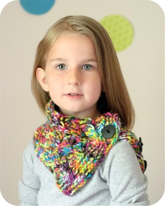 Pick a multistrand, multi color yarn and let your scarf go CRAZY! A quick knit in bulky weight yarn makes this a great last minute gift idea or a treat for yourself! Three cables wrap around the wearer, connecting at a button band that adjusts for a few different styling options. Wear with 2 buttons undone and let it split over your shoulder or button everything up and wear it high on your neck for a warm pop of color.