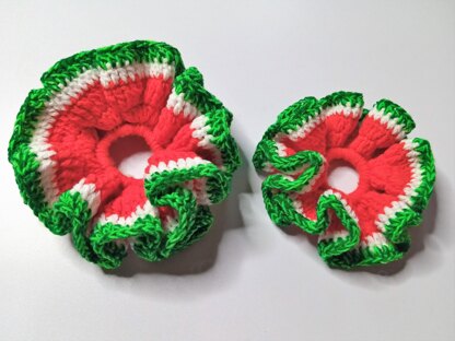 This watermelon inspired crochet scrunchie is simple and easy to make, the stiches you'll need to be familiar with are chain, slip stitches, single crochet, double crochet, half double crochet and treble crochet. This project works up very quickly and it can be completed in les than 30 miutes. The pattern is writen for two; a medium and a large size.