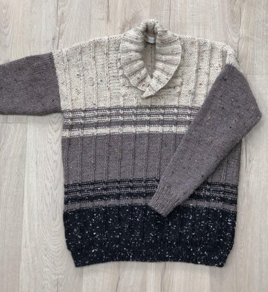 A beautifully cosy, casual sweater. The back and front are worked in a background of reverse stocking stitch intersected by striking single rib verticals. A lovely cross-over inset collar in wide rib is perfect for cooler days. Sleeves are worked in stocking stitch with 2/2 ribbed cuffs to match the welt. Worked bottom up and with full written instructions.