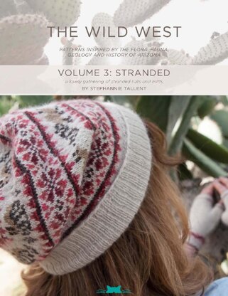 The Wild West: Patterns Inspired by the Flora, Fauna and Geology of Arizona is a collection of 5 print & PDF books. The third, Stranded, includes the following patterns: Ringtail hat, Ringtail Mitts, Organ Pipe beanie, and Organ Pipe Mitts.