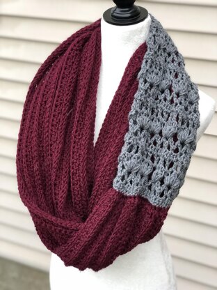 A lace laden infinity super scarf for the romantic in all of us! This vintage-y piece features a knit-like texture on the wrapped portion and an eye catching puff stitch lace accent which can be made in any colour.