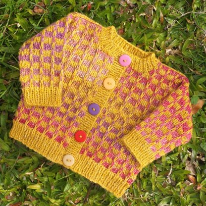 The Xanadu cardigan is knitted bottom up until the sleeves and then the fronts and back are worked separately. The sleeves are picked up at the armholes and then worked top down. The texture and colours come from using a plain and variegated yarn combined with slipped stitches.
