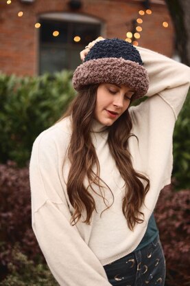 Jump on the color blocking trend with this snuggly fleece sherpa beauty – a sister pattern to the knit Teddy Bucket Hat. The jumbo yarn works up in no time and produces the ultimate trendy accessory for the season.