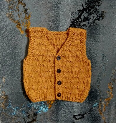 A textured vest pattern with a matching square hat. Knitted in one piece from the bottom up this cute little vest and hat are a great wardrobe addition.