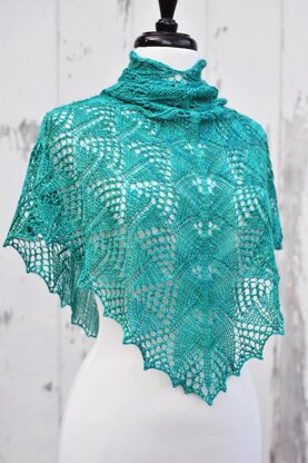 Worked from the top down this is not quite your average triangle shawl. The edge increases create a slowly expanding reverse stockinette ground with tendrils of seaweed and the "spine" increases develop into dolphin tails traipsing down the center of the shawl.