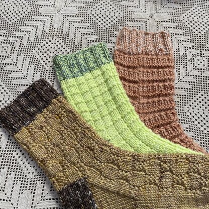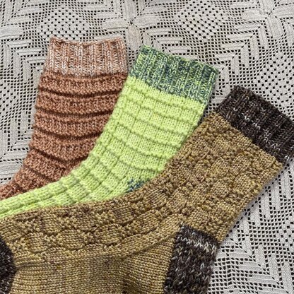 These socks are my attempt to create more options for socks knit with sock yarn held double. I have come to prefer the warmth and squishiness of thicker socks, and I love that it uses a full skein of sock yarn plus some minis or leftovers. The heels, toes and cuffs are knit the same, and there are three options for patterning, and all are easy to memorize once the pattern is established.