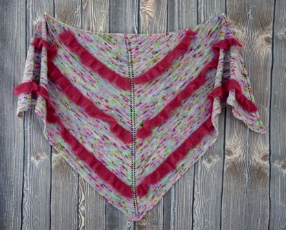 Thirty, Flirty and Thriving is a top down triangle shawl that features a garter tab cast-on and simple triangle shaping. This easy to memorize pattern is mainly stockinette stitch with garter bumps interspersed, these garter bumps turn into the base for your ruffle!
