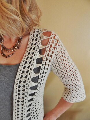 Interesting stitches, simple lines, and just a few decreases make Thisbe the ultimate first garment project! Crocheted lace panels are worked sideways without seams to create the body of this drop shoulder jacket. Thisbe is perfect with skinny jeans or leggings and boots for fall or over a swimsuit and sandals in summer. The ultimate in crochet bohemian chic, make free-spirited Thisbe for an easy wardrobe piece that will carry you through the seasons.