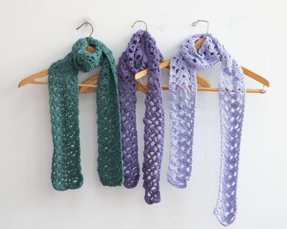 Three easy crochet patterns for cotton scarves in pretty lacy patterns. Light weight scarves for spring, summer and fall or fashion accessories all year. The patterns work up quickly.