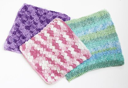 Three easy crochet pattern for washcloths. Each uses different and interesting stitch combinations. They work up quickly. The pattern calls for Lily Sugar n Cream yarn but you can substitute most worsted cotton yarns.