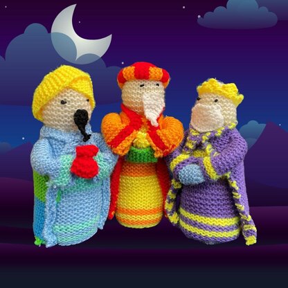 The kings are designed with dress and robe in bright colours. The robes are finished with a trim and fluted arms. Each king has individual beard, head dressing and gift.