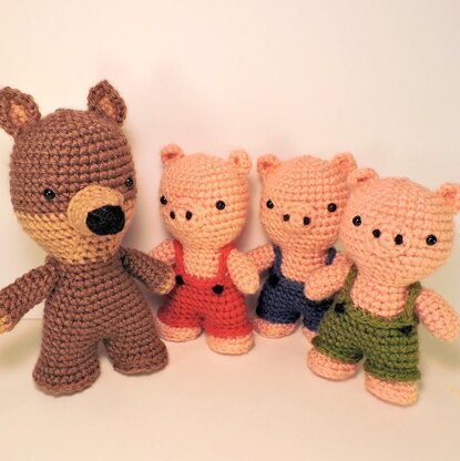 This Three Little Pigs and the Big Bad Wolf pattern set features original amigurumi designs. Your PDF purchase includes the patterns for all four characters in this set. You'll need the yarn colors pictured (worsted weight), a size E crochet hook, safety eyes, a yarn needle, and an intermediate crochet skill level. The finished toys are 5 1/2" - 7" tall. These toys are a favorite with kids who love story-telling and acting out the classics!