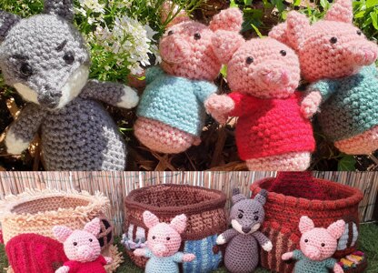 Your kids will love to play with these 3 little pigs and the big bad wolf. This set was designed so you can easily stack and organize all the toys in the brick house. The little pigs, big bad wolf and cauldron fit easily inside the straw house, the straw house fits inside the stick house and the stick house fits inside the brick house. Skill Level: Intermediate, previous experience with Amigurumi is highly recommended Included patterns: - Little pigs - Big Bad Wolf - Straw House - Stick House - Brick House Sizes of finished pieces using Aran weight yarn: - Little pigs - 14 cm long - Big Bad Wolf - 17 cm long - Straw House - 15 cm long and 20 cm diameter - Stick House - 15 cm long and 22 cm diameter - Brick House - 16 cm long (24 cm with chimney) and 28 cm diameter