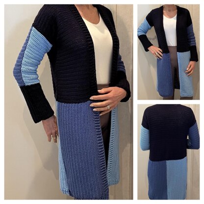 This colorblock long sleeve casual/ chique cardigan, will stand out in a crowd! Relaxed fit with dropped shoulders and above-knee length. Choose your own 3 favorite colors to create this true eyecatcher. Lightweight yarn ( weight3 / DK) makes it suitable for spring, summer end even fall weather. HDC and ribbing stitches make it easy to make for all level crocheters!