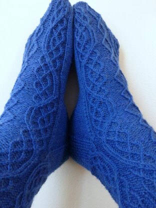 The lattice cables on the sides of these elegant socks seem to flow down through the winding cables. Like sands through an hourglass, so go the stitches of our lives...