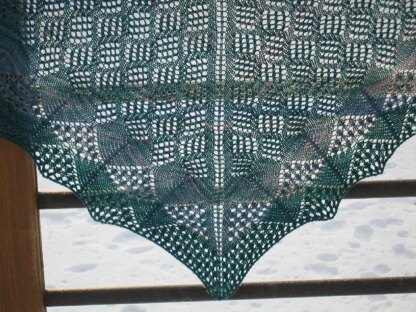 The design is worked with two colors instead of one (though you could do it all in one color). You work two rows of one color, then two rows of your second colors. When the body of the shawl is finished, you work the first border in your lighter color, and the last border in the darker color. The result is a nice, soft blending of colors.