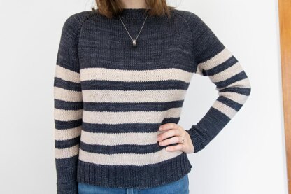 Thun, pronouced like Toon, is a top down seamless raglan sweater with a split hem and stripes in the body & sleeves.