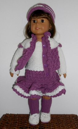 Set includes long waisted ruffled skirt, cardigan sweater, tank top, stormy kromer style hat and socks and shoes.
