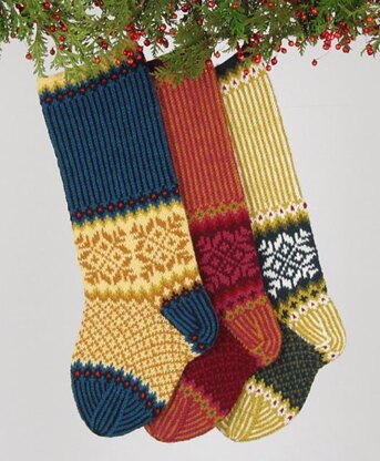 Pattern provides clear written instructions, along with color charts for each colorway, to knit a Christmas stocking in the round.