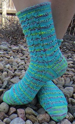 This sock plays with striped colorwork using lace and purls to bring the sparkles forward, similar to Bohus knitting but using the colors one at a time instead of stranding.