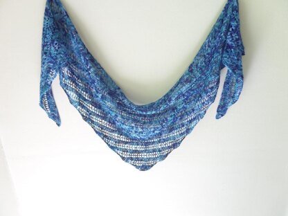 Tide is a triangular shawl worked side-to-side in a simple, repetitive lace pattern, which is well suited to highly variegated yarn. Choose the wildest skein from your stash and watch the colors subtly swirl around the eyelet stripes! The side–to-side construction makes a shallow triangle shape that grows faster in length than it does in width, making a respectable size shawl with a single skein of fingering weight yarn. Three sizes are given in the pattern, and further adjustments can be made by changing your gauge or yarn.