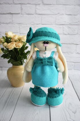 Bunny Doll, set "Tiffany". Today Bunny made a bet for classical things -a close-fitting blouse, a great sundress, comfortable moccasins and a magnificent, charming hat with a bow. This pattern is very easy. It has beginner level. It is totally crochet pattern. Nothing redundant. You should have the basic knowledge of crocheting, some balls of yarn and a crochet hook. Pattern has simple written instructions - 24 pages in 2 lines of text in the PDF format. It includes over 60 photographs, step-by-step description of the process 5 pieces of clothes creating for 32-cm length Doll + my advice and replies at any stage of your work This pattern does not have the instructions of basic elements of crocheting.