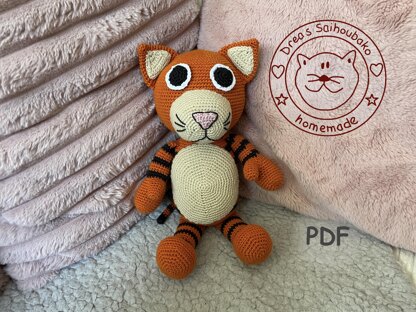With yarn length 160m/50g this tiger is about 35 cm high.